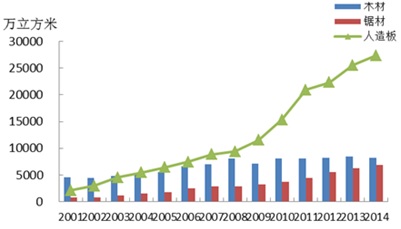 图5-1 2001~2014年全国木材及人造板产品产量