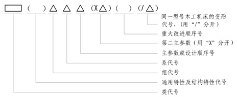 木工机床型号是用汉语拼音字母和阿拉伯数字组成的。这些字母与数字可以表明木工机床所属的系列、主要规格、性能和特征,便于使用单位选用与管理;便于产品开发部门作系统的研究和探讨;还可以从编号中了解到木工机床的发展过程。木工机床型号的表示方法如图5-2所示。