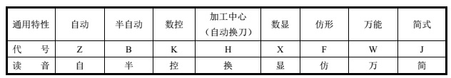 当某种类型木工机床,除有普通型式外,还有下列某种通用特性时,则通用特性在类代号之后予以表示。若此类型木工机床仅有某种通用特性而无普通型式者,则通用特性不予表示。一般在一个型号中只表示最主要的一个通用特性(少数特殊情况,可以表示两个),通用特性代号在各类木工机床型号中表示意义相同。通用特性代号如表5-2所示。