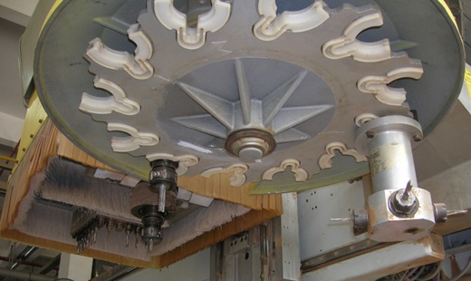 主轴数量及其排列方式:多轴平行排列,这种方式结构为刀轴固定排列、间距固定,不带换刀功能。转塔排列,刀具均布在转塔周边,由计算机控制转塔旋转进行换刀。单轴铣或双轴铣带自动换刀功能,或配有刀具库。图8-10所示为某型加工中心的转位刀具库。