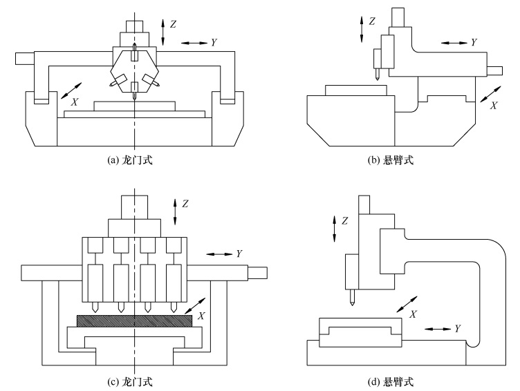 1、木工数控加工中心按运动形式不同可分为三种类型(图8-8)。工作台固定,三坐标运动均由刀轴系统完成,即悬臂式结构;工作台完成单向(X或Y向)运动,刀轴系统完成两向(Y、Z或X、Z向)运动,即龙门式结构;工作台完成两向(X、Y向)运动,刀轴系统完成单向运动,即单立柱结构。