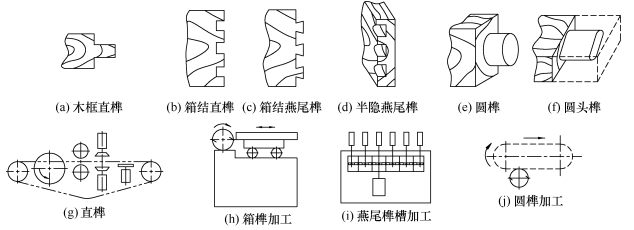 木制品的联接广泛地采用榫结合的方法,这种方法是用一零件端头的榫头插入另一零件端头的榫槽中。榫槽与榫头的形式决定于零件的外形;例如框架的结合采用木框榫结合(图9-1a),箱板结合则采用箱结榫,箱结榫又分为直角榫(图9-1b)、半隐燕尾榫(图9-1d)和燕尾榫(图9-1c)。