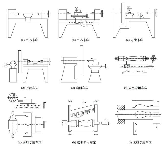 木工车床根据用途不同可分为:中心车床(图9-11a、b)、万能车床(9-11c、d)和端面车床(图9-11e),另外还有多刀木工车床、木工仿形车床等。