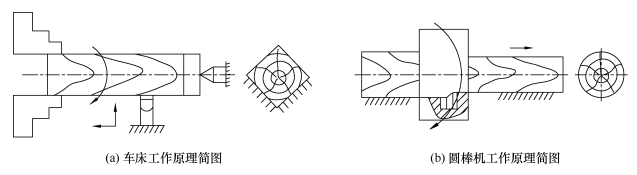 木制品中的旋转体,如圆柱表面、异形表面以及端面,都是通过旋转运动和直线运动合成的,而车床和圆棒机就是根据表面成形运动的原理工作的。在车床上,工件旋转,切刀做直线纵、横向移动。在圆棒机上,工件直线纵向移动,刀具旋转。车床能车削工件的外圆表面和端面(图9-10a),而圆棒机只能铣削圆棒(图9-10b),不能完成其他加工。