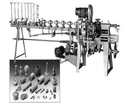 除此而外,还有种类很多的专用木工车床,如靠模木工车床。这类车床有立式和卧式的,可以加工复杂的外形表面,如椅子腿、步枪枪托等不规则形状的产品。图9-12所示为全自动背刀车床,图9-13所示为木工专用车床,图9-14所示为木工圆棒机。