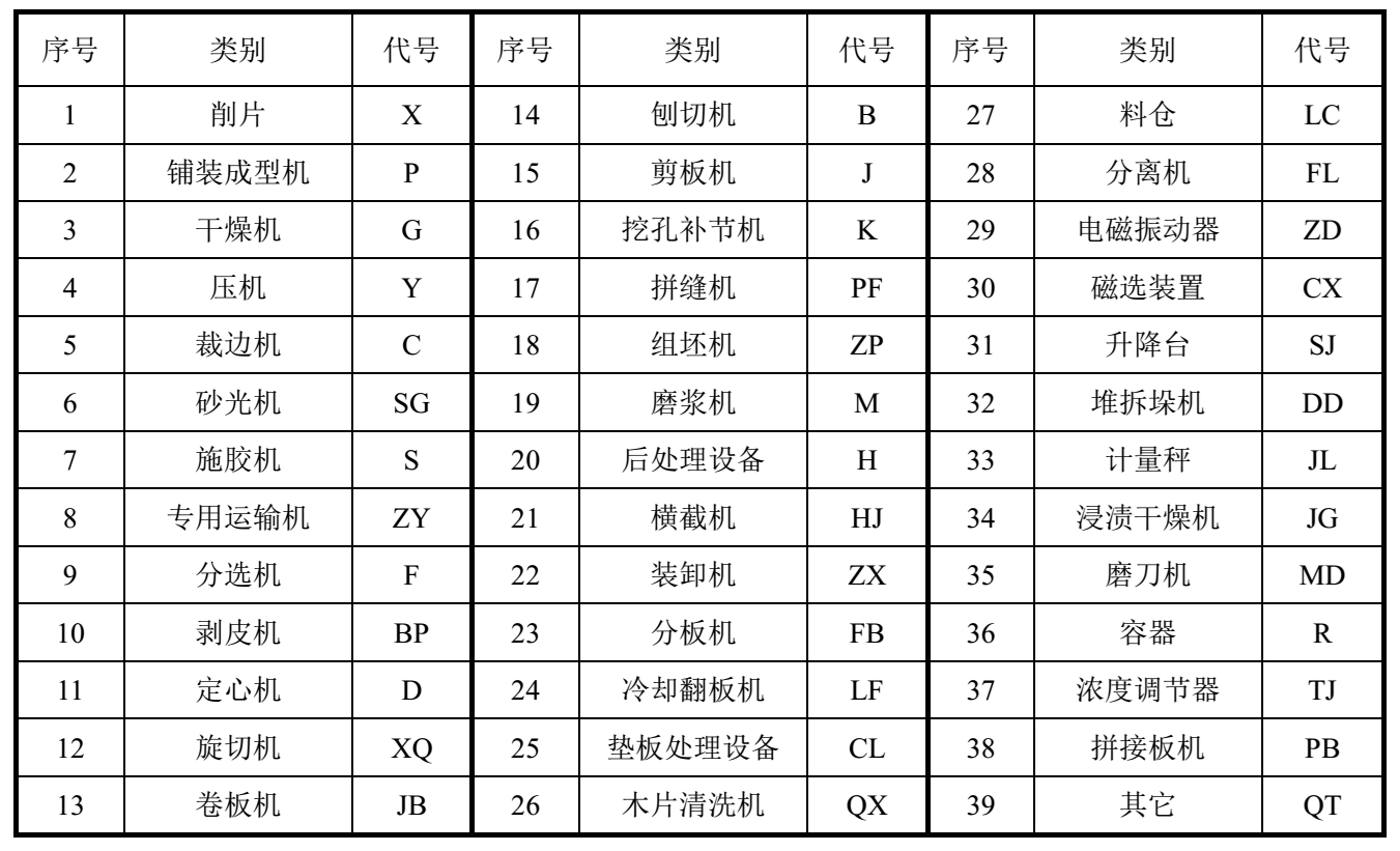 我国现行国家标准《GB/T18003-人造板机械设备型号编制方法》中将人造板设备划分为39类,如下表5-1所示。
