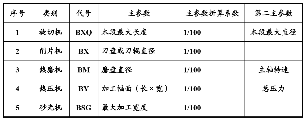本课程中涉及的典型人造板机械的代号、主参数及第二主参数等见下表5-2。