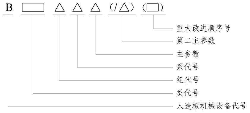 人造板机械的型号是由汉语拼音大写字母和阿拉伯数字共同组成,用以表示设备的名称、类型、组系和型系的代号以及主参数等,其基本形式如下: