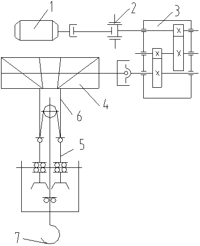 1.电动机 2.联轴器 3.减速器 4.卷筒 5.滑轮组 6.钢丝绳 7.吊钩