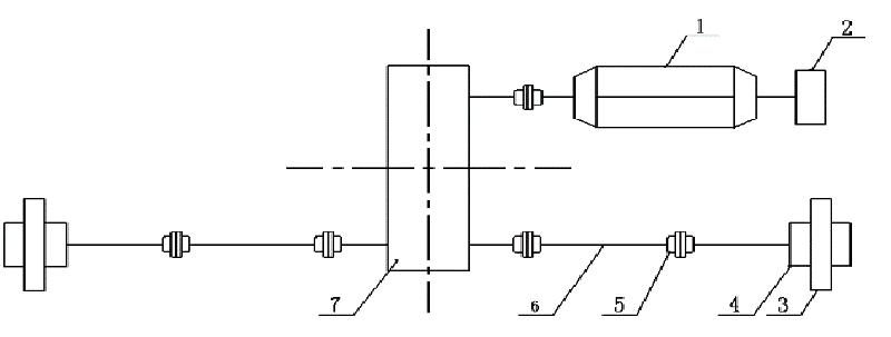 1、电动机 2、制动器 3、减速器 4、传动轴 5、联轴器 6、角轴承架 7、车轮