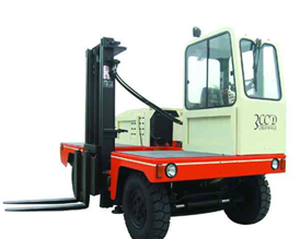 还有一种是叉车类型的木材装载机,有铲取木材的液压叉,适合于木材加工厂和贮木场制材车间作板材、方材和原木等的装、卸、短途运送和归楞作业等;它可以和仓库、车站的叉车相通用。叉车分正面叉车和侧式叉车两种。叉车主要有两个机构:一是起升机构,能将物品作垂直升降;另一是运行机构,能携带着物品在地面上行驶。它和工程装载机类型的木材装载机一样,能在起重工作中带载运行。近年来,世界各国叉车的生产量增长很快,随着集装箱运输的发展,叉车的应用范围也相应扩大,品种在不断增多。林业生产中主要应用侧式叉车,因为侧式叉车可以用搬运长料,如木材、钢材、集装箱等(图3-24所示)。