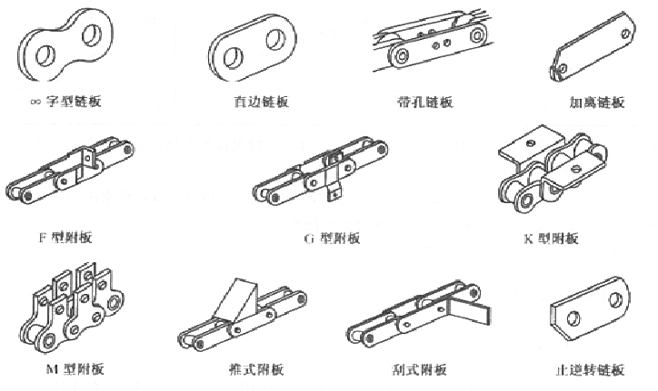 链条根据结构可以划分为滚子链条、套筒链条、多板链条和其他结构链条;根据用途分为传动链条、输送链条和其他用途链条,其中链条的功能在一定程度上取决于链板的形状,链板的形状如图3-19所示。