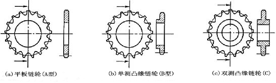 链轮形式有3种,即平板链轮(A型)、单侧凸缘链轮(B型)和双侧凸缘链轮(C型)。