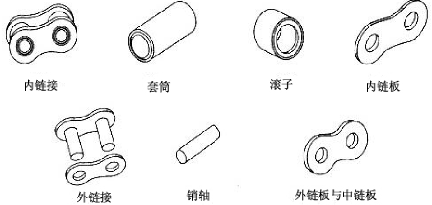链条是由内链节、套筒、滚子、内链板、外链节、轴销、外链板和中链板等部分构成。