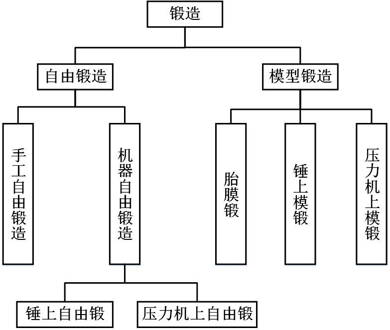 根据采用的设备、工具和成形方式的不同,常用锻造方法可分为如图1.1所示的分类。