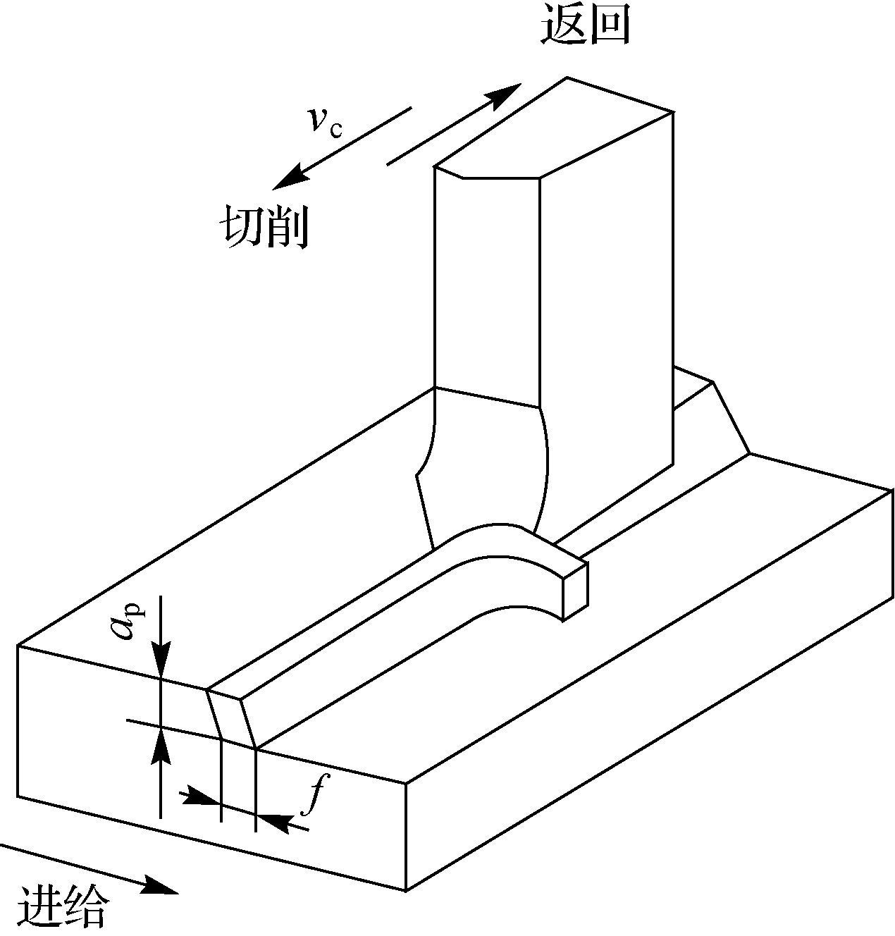 在刨床上使用单刃刀具相对工件做直线往复运动进行切削加工的方法,称为刨削(图7-1)。刨削加工是金属切削加工中具有明显特点的加工方法,其直线单向切削的加工效率虽然不高,但在机床床身导轨、机床镶条等较长较窄零件表面的加工中,刨削有较大的优势。