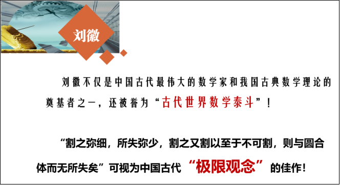 公元3世纪,我国魏晋时期的数学家刘徽在注释《九章算术》时创立了有名的“割圆术”,他创造性地将极限思想应用到数学领域。他设圆的半径为一尺,从圆内接正六边形开始,每次把边数加倍,用勾股定理算得圆内接正十二、二十四、四十八…边形的面积,内接正多边形的边数越多,内接多边形的面积就与圆面积越接近,正如刘徽所说:“割之弥细,所失弥少,割之又割,以至不可割,则与圆周合体,而无所失矣”。这已经运用了极限论的思想来解决求圆周率的实际问题了,“以至不可割,则与圆周合体”,这一思想是墨家“不可分”思想的实际应用。