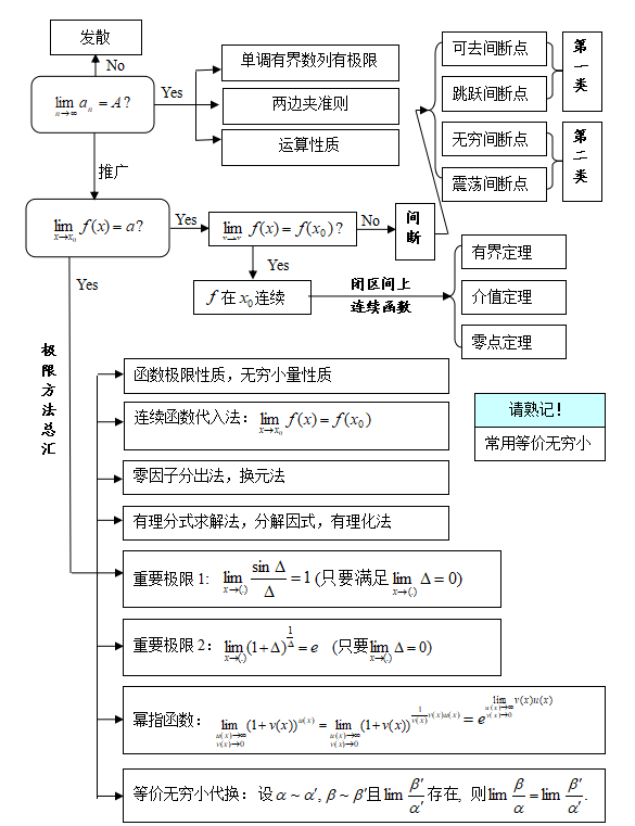 数列极限与函数极限的定义及其性质、函数的左极限与右极限、无穷小量和无穷大量的概念及其关系、无穷小量的性质及无穷小量的比较、极限的四则运算、极限存在的两个准则:单调有界准则和夹逼准则、两个重要极限、函数连续的概念、函数间断点的类型、初等函数的连续性、闭区间上连续函数的性质.