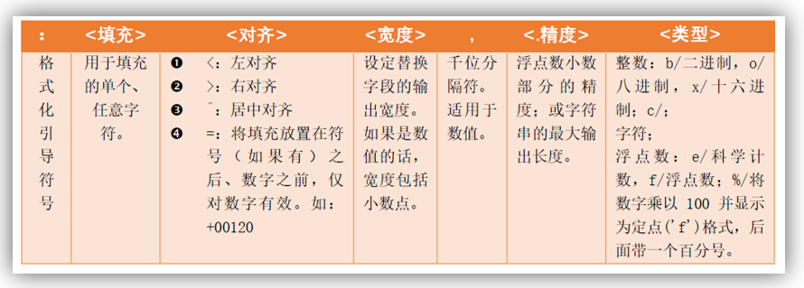 str.format( )格式化字符串更容易阅读,它避免了以前技术的许多缺点和限制。format( )函数格式化字符串方法类似于提前准备好一个模板,在这个模板字符串中,需要引用其它值(比如某个变量)的地方就设置一个可替换的字段(一对大括号{ }括起来的替换域),可替换字段以外的字符串照原样输出,可替换字段换成相应的值。如果要设置多个可替换字段,用[0,1,2,...]的序列索引表示。format( )格式化大多数情况下与旧式的%格式化类似,基本上就是用{ }和:来取代%。常用的格式规范如表所示。