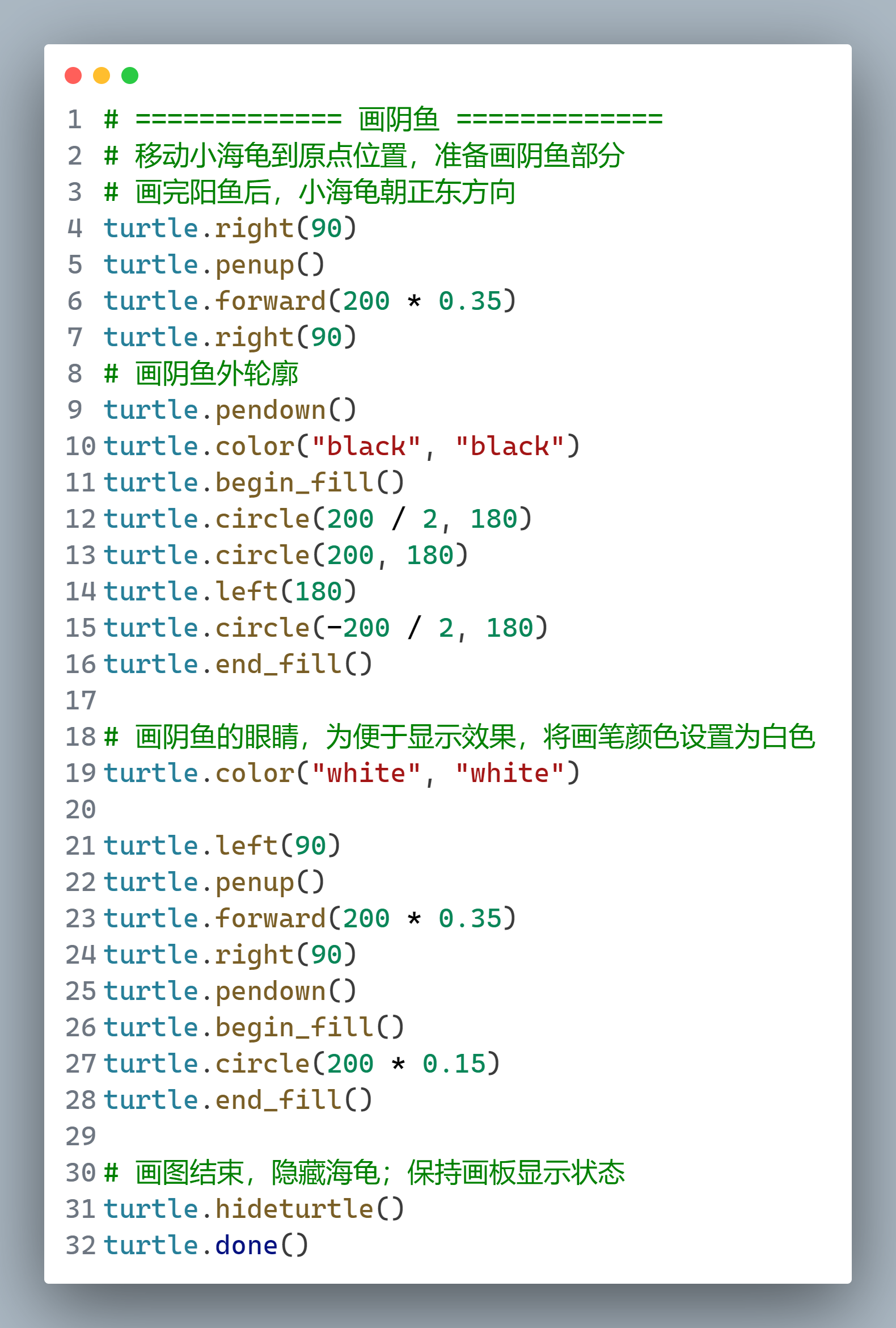 Python编程中的顺序语句可用简单理解为从上至下、逐条执行,就像画太极图的过程,先画鱼头,再画鱼身,最后画鱼眼,相关代码依次执行、逐行执行,每执行一行代码,屏幕上将多增加一条线。