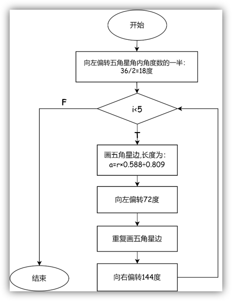 画五角星的过程是一个循环的过程,绘制五角星的完整过程包括10条边线和5个外夹角,而这个过程只要把画2条边线夹1角的过程重复5次即可实现。画五角星的具体流程图见下图。
