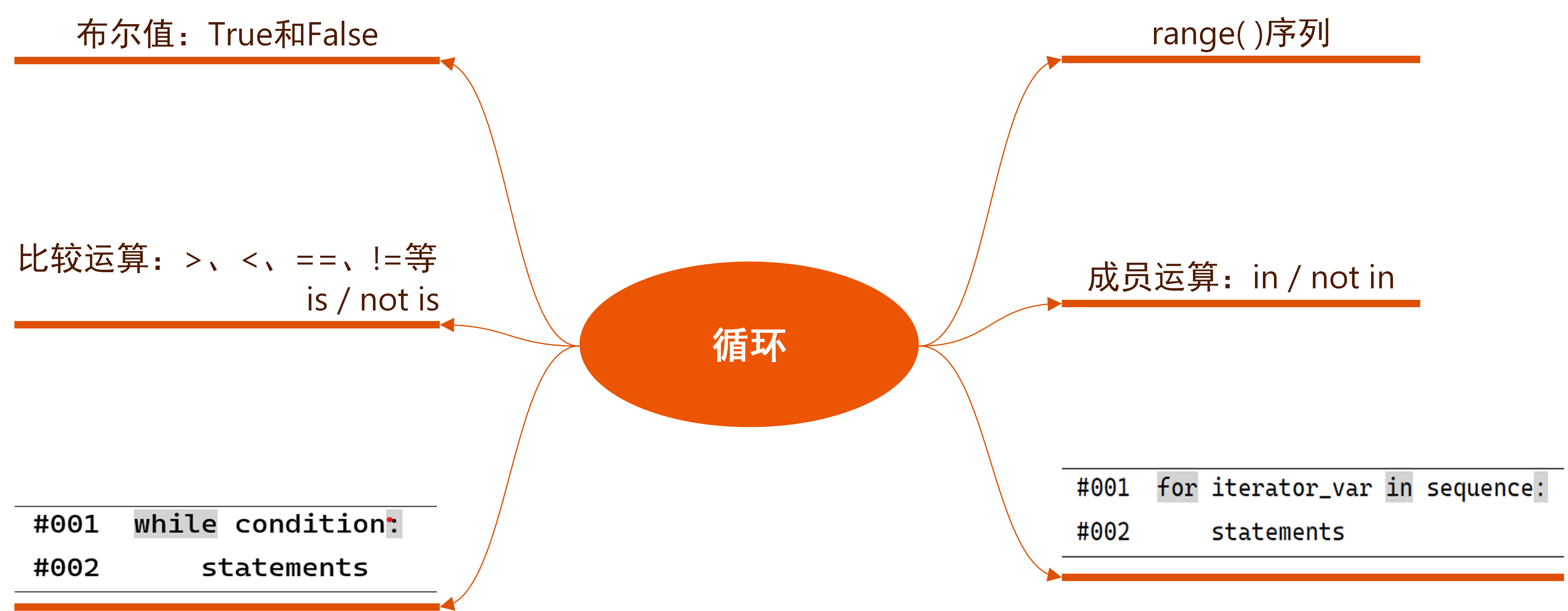 for/in循环一般用于迭代序列(如字符串),可以使用range( )函数得到一个升序的整数序列,如果要一个降序的整数序列可以使用reversed(range())进行反转。in为成员运算,可配合容器(collection)对象一起使用。