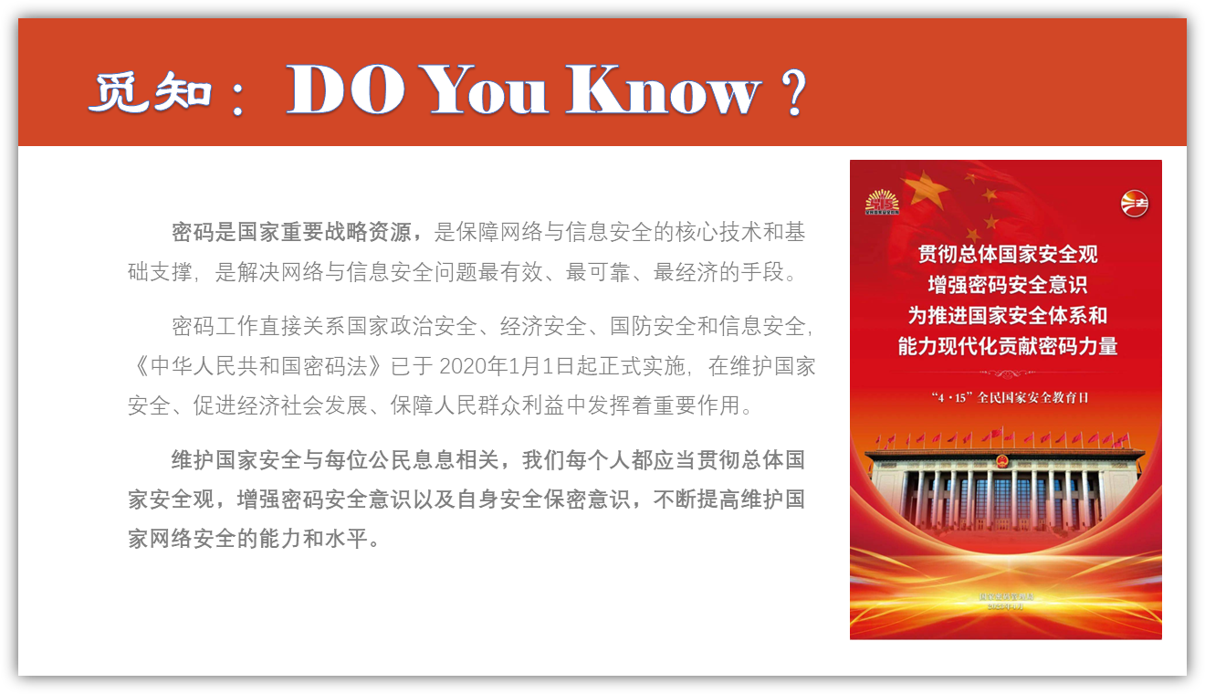 密码是指采用特定变换的方法对信息等进行加密保护、安全认证的技术、产品和服务,密码主要是用来加密保护信息和进行安全认证,密码在网络空间中主要应用于身份识别、安全隔离、完整性保护、信息加密和抗抵赖性等方面,具有不可替代的重要作用。提升安全意识、保护个人账户密码安全是每个人的必修课,2020年1月1日起《中华人民共和国密码法》式实施,维护国家安全与每位公民息息相关,我们每个人都应当增强自身安全保密意识,提高维护国家网络安全的能力和水平。