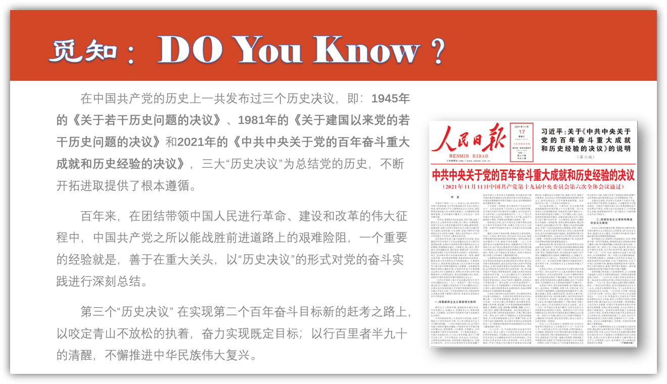 以史为鉴是中华文化的一个重要特征,每到重要历史关头,中国共产党都会总结党的历史,从中吸取历史智慧,掌握历史主动。在中共党的历史上一共发布过三个历史决议,即:1945年的《关于若干历史问题的决议》、1981年的《关于建国以来党的若干历史问题的决议》和2021年的《中共中央关于党的百年奋斗重大成就和历史经验的决议》(以下简称《决议》)。《决议》回顾了党走过的百年奋斗历程,总结了百年奋斗取得的“四个伟大成就”“四次伟大飞跃”,并用“十个坚持”概括中国共产党百年奋斗的历史经验:坚持党的领导、坚持人民至上、坚持理论创新、坚持独立自主、坚持中国道路、坚持胸怀天下、坚持开拓创新、坚持敢于斗争、坚持统一战线、坚持自我革命。