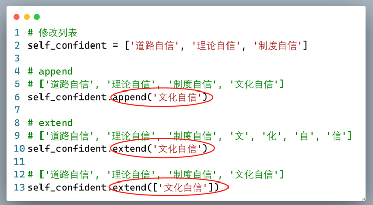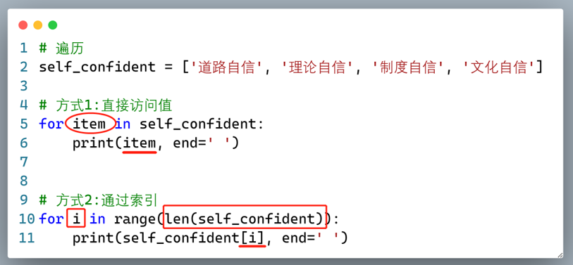 遍历列表有两种方式,一种是通过序号,一种是直接通过遍历值。如下是对“四个自信”列表值的两种遍历方式。