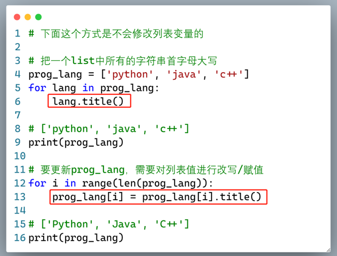 在对列表进行遍历时,对迭代变量的修改并不会影响列表。要影响列表的值,就必须要将修改后的值写回列表,即在循环体中有对列表数据项的赋值操作。