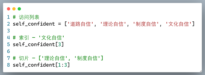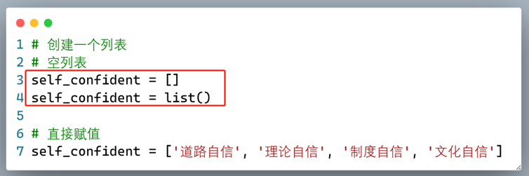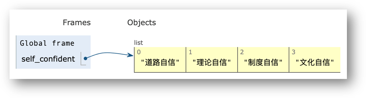 列表(list)是Python中的四种容器(collection)数据类型/结构之一,是Python中最具灵活性的一种高频使用的数据类型,由一系列按特定顺序排列的数据项组成,用一对中括号([ ])来表示,并用逗号(,)来分割列表的各个数据项。列表是一种可变(mutable)数据类型。比如我们创建一个“四个自信”的列表: