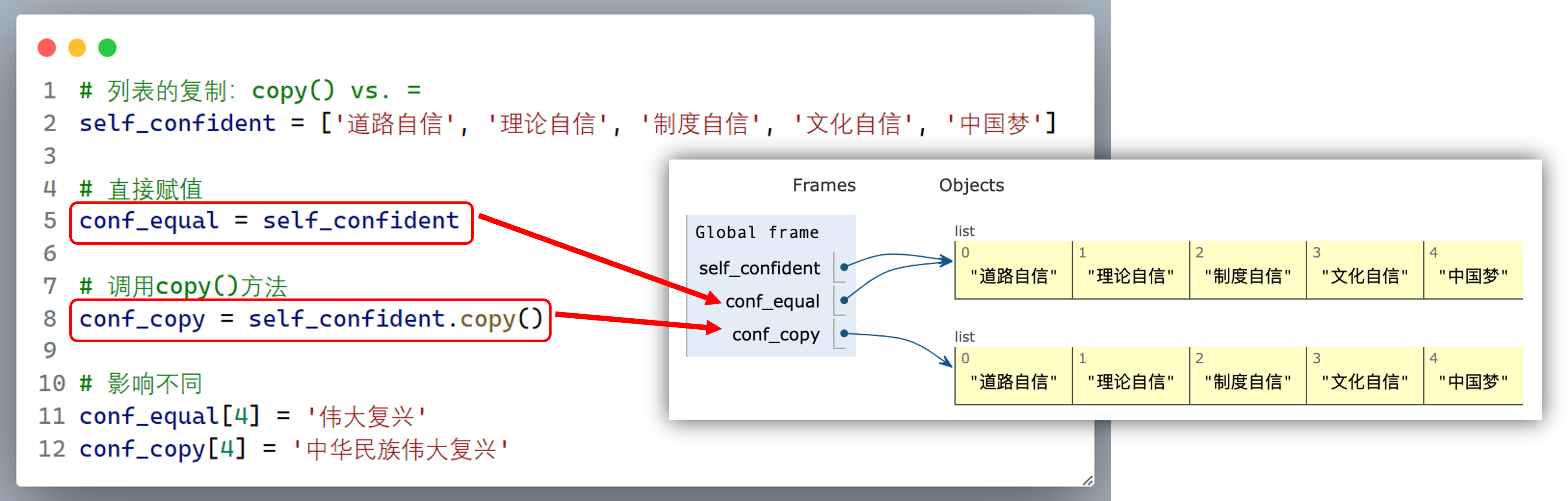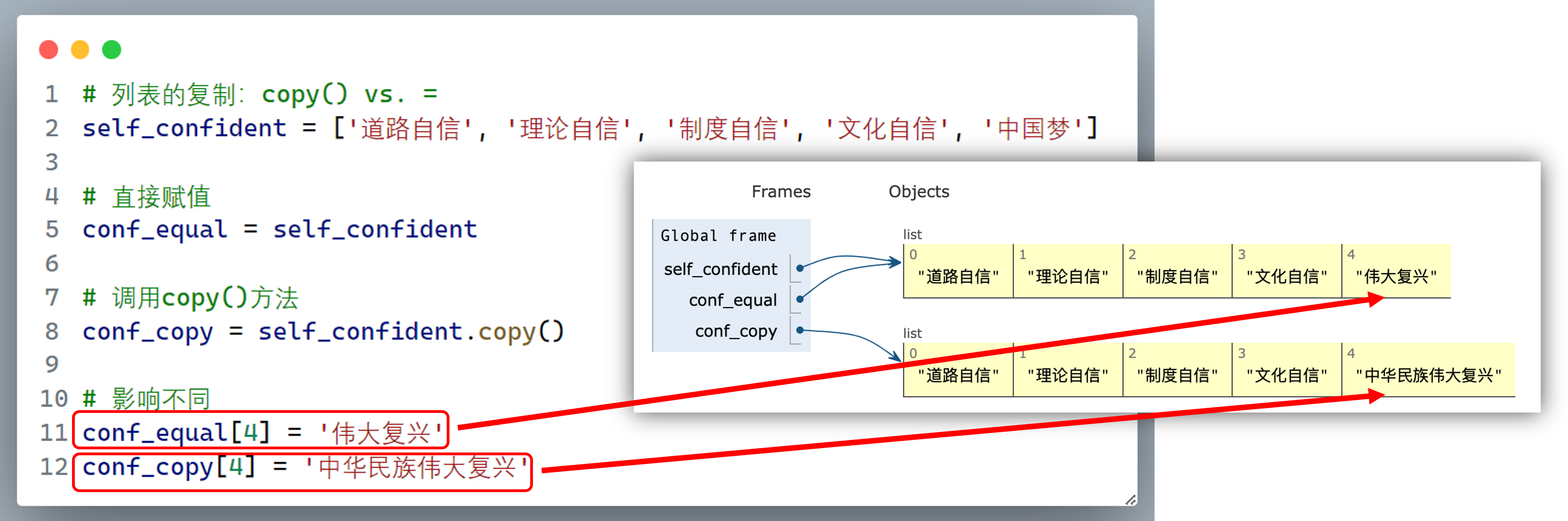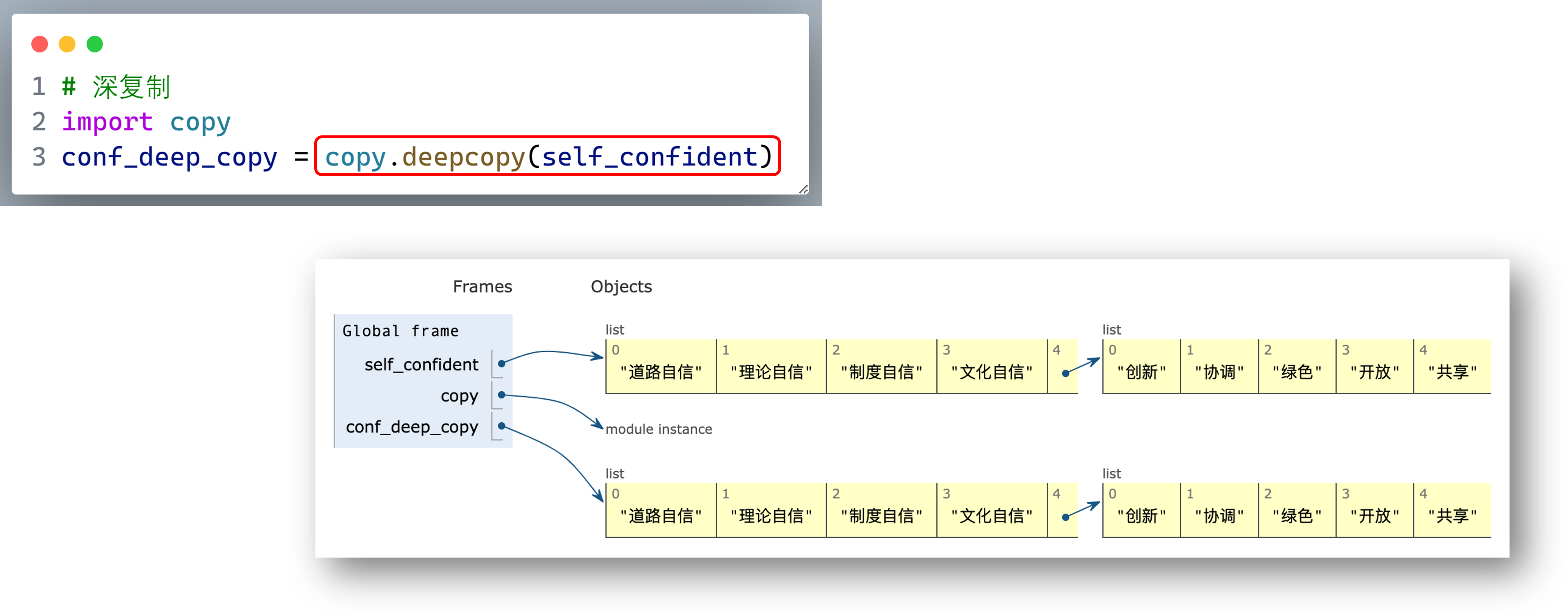 虽然用列表的copy( )方法生成了一份单独的拷贝,但因为self_confident列表中的“五大发展理念”是一个嵌套列表,copy( )方法并未为嵌套列表生成拷贝,所以self_confident和conf_copy共用了嵌套列表对象,这就是所谓的浅复制。