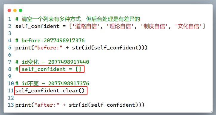虽然来自于同一列表self_confident值的不同列表变量conf_equal和conf_copy,虽然两个变量的值都相同,但两个变量标签却指向不同的内存地址空间,对两个列表变量值的修改,其影响也必然不同。