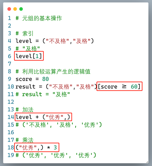 如图所示的代码中,score的值为80,表达式score >= 60的值为True,也就是整数1,即result得到的结果就是对元组位序为1的元素进行访问,得到答案“及格”字符串。
