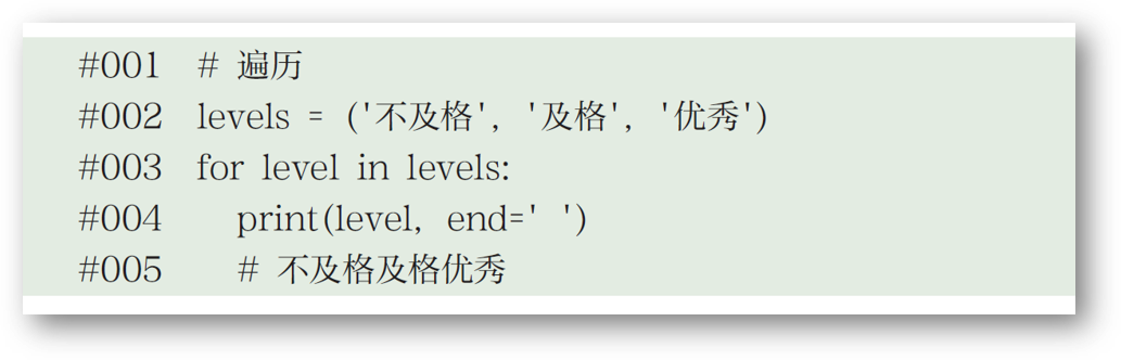 和其它线性结构的数据类型一样,元组也支持遍历操作,直接通过for–in的成员运算符进行迭代就可以访问到元组中的每一个数据项。