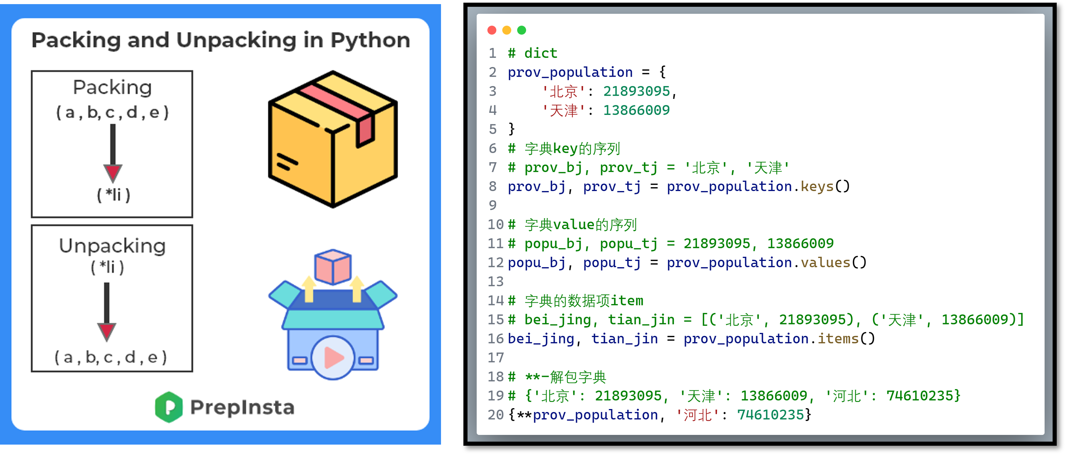 解包(unpacking)就是把一个容器(collection)数据进行分解、逐个取出来,任何可迭代对象都支持解包操作,包括字符串、列表、元组、字典、集合等,Python对可迭代对象的解包操作都是自动完成的。在表达式、函数调用中,还可以使用一个或两个星号(*,或**)解包可迭代对象,其中:用一个星号解包序列,用两个星号解包字典。