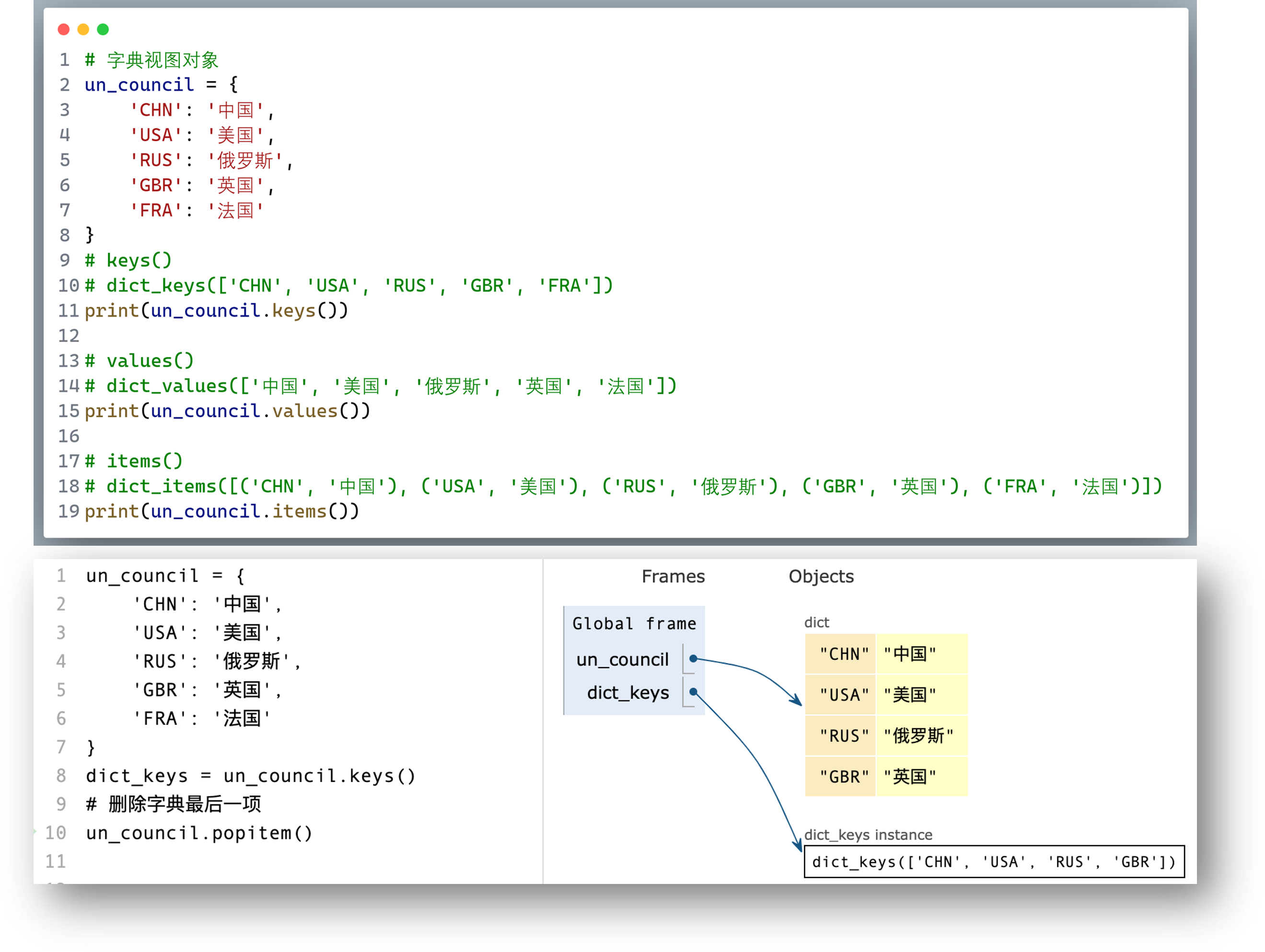 字典视图对象(Dictionary view objects)是指由dict.keys( ),dict.values( )和dict.items( )所返回的对象,该对象提供字典条目的一个动态视图,字典视图可以被迭代以产生与其对应的数据,并支持成员检测。