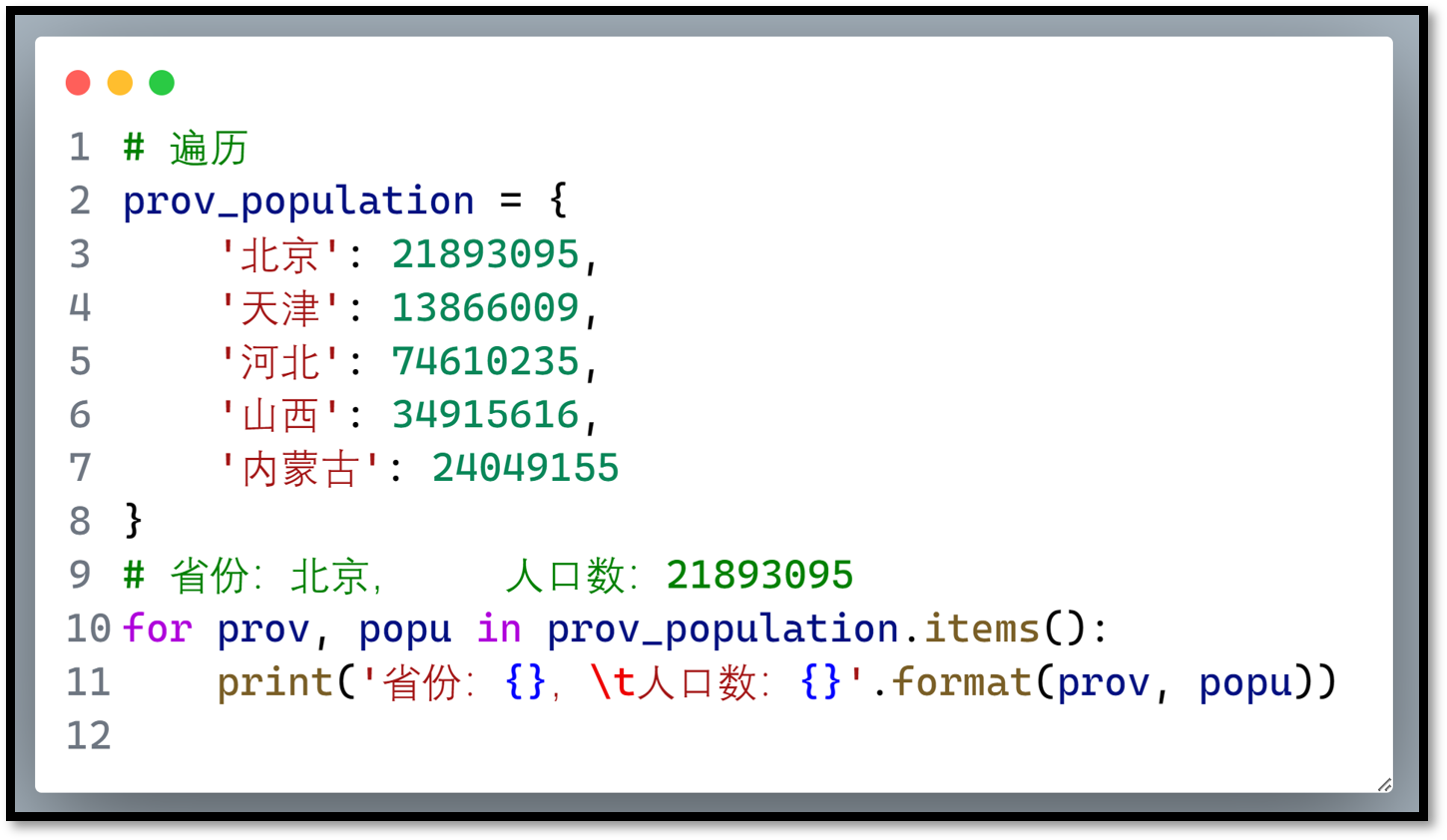 使用字典的方法keys( )、values( )、items( )可以分别遍历字典的键、值和键值对/数据项,但需要注意的是直接遍历字典对象默认是遍历字典的键key,需要深度处理字典数据项的话,可以通过items( )获得字典的每一个数据项,然后对其进行解包、分别获得key和value。