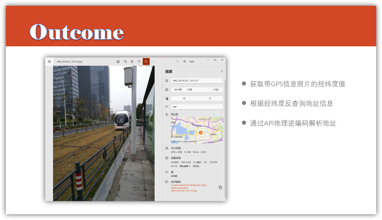 本学习单元,我们将读取一张带GPS信息的照片文件,获取其中的经纬度值,然后再通过地理逆编码发起查询,最终得到拍摄照片的具体地址信息。为简化操作,我们只需要能将照片的GPS信息和拍摄照片的地址信息打印输出即可,不需要在地图上进行标注。