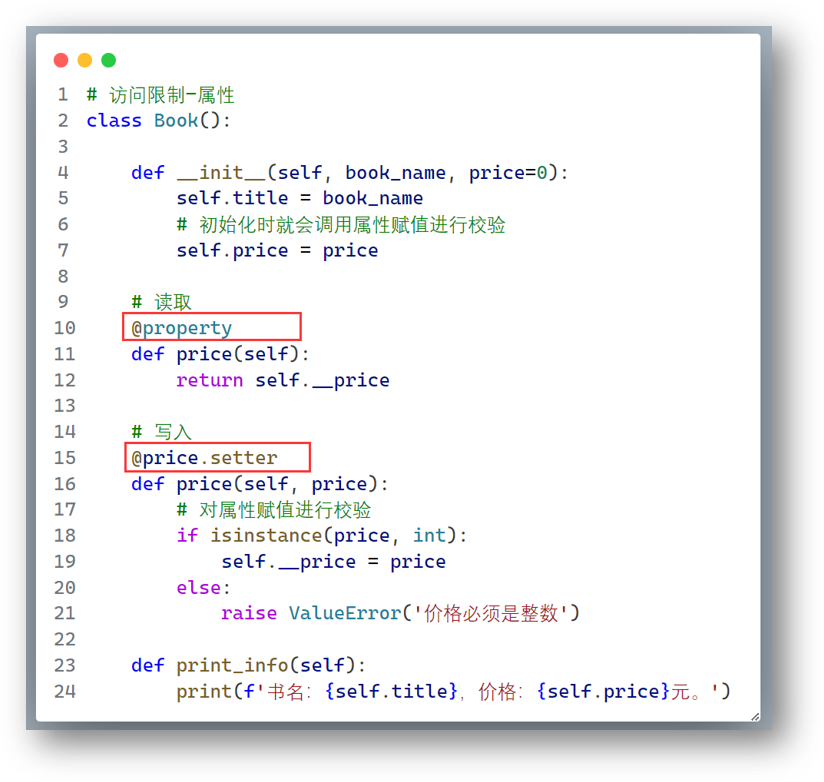 Python为我们提供了属性装饰器@property,将方法变成属性调用。用“@property”装饰的方法为读取操作,其实就是实现了getter功能,用“@属性名.setter”装饰的方法为写入/赋值操作,其实就是实现了setter功能,定义方法的时候“@property”必须在“@属性名.setter”之前,且二者修饰的方法名相同,如果只实现了“@property”而没有实现“@属性名.setter”,那么该属性就成为了只读属性。