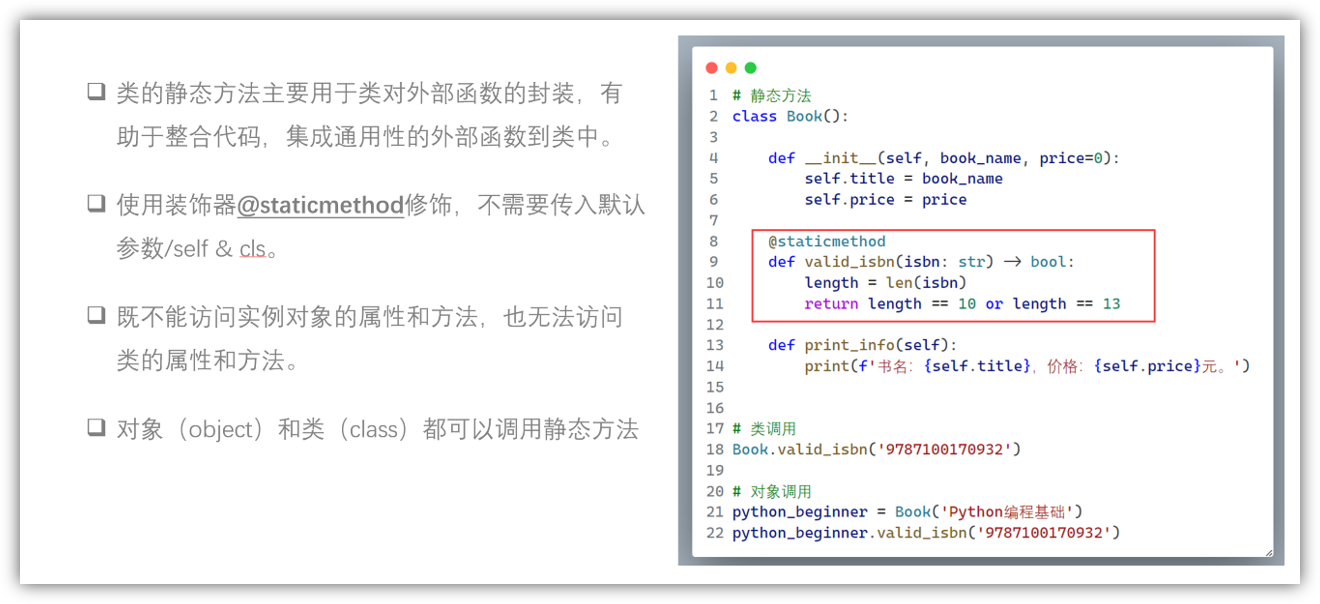 类的静态方法主要用于类对外部函数的封装,有助于整合代码,集成通用性的外部函数到类中。静态方法使用装饰器@staticmethod修饰,它不需要传入默认参数,既没有实例对象方法中的self,也没有类方法中的cls。因此,它既不能访问实例对象的属性和方法,也无法访问类的属性和方法。