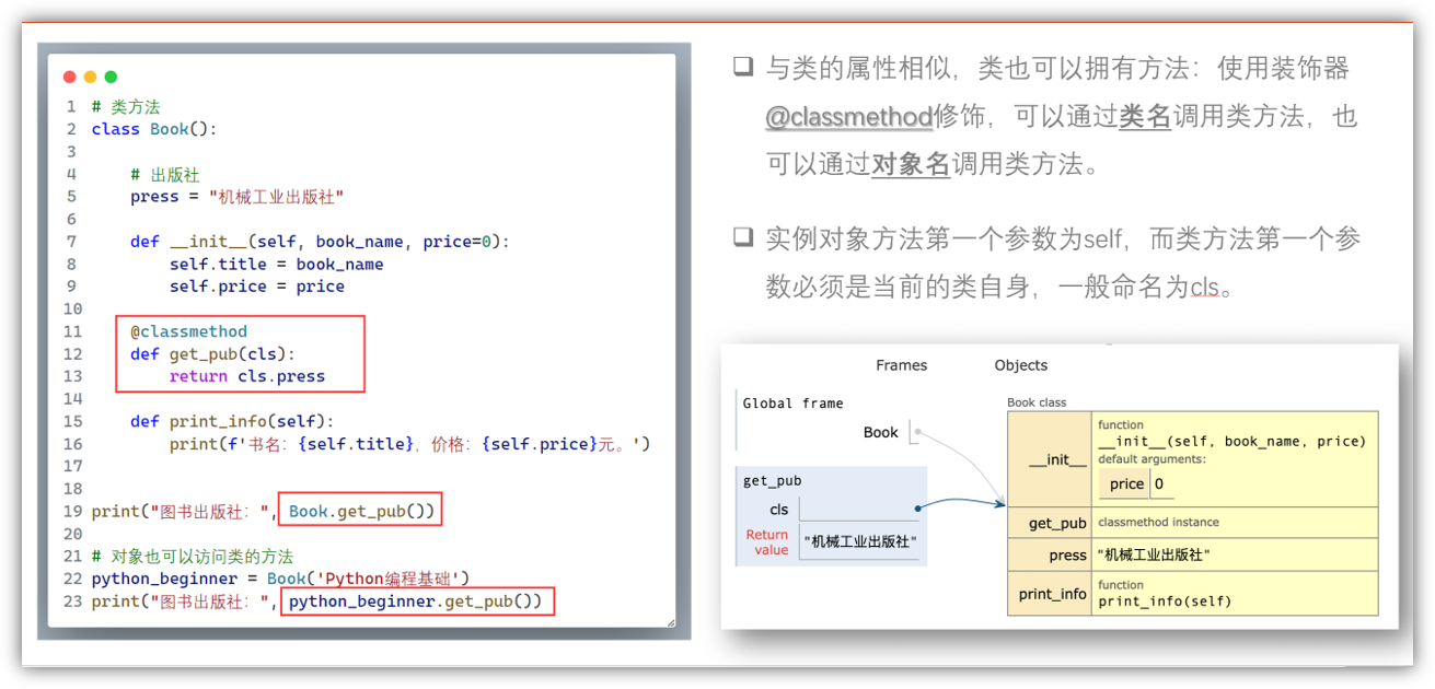类方法要使用装饰器@classmethod修饰,实例对象的方法第一个参数为self,而类方法第一个参数必须是当前的类自身,一般命名为cls。可以通过类名调用类方法,也可以通过对象名调用类方法,在类的方法中可以调用类本身的其他方法,也可以访问类成员。