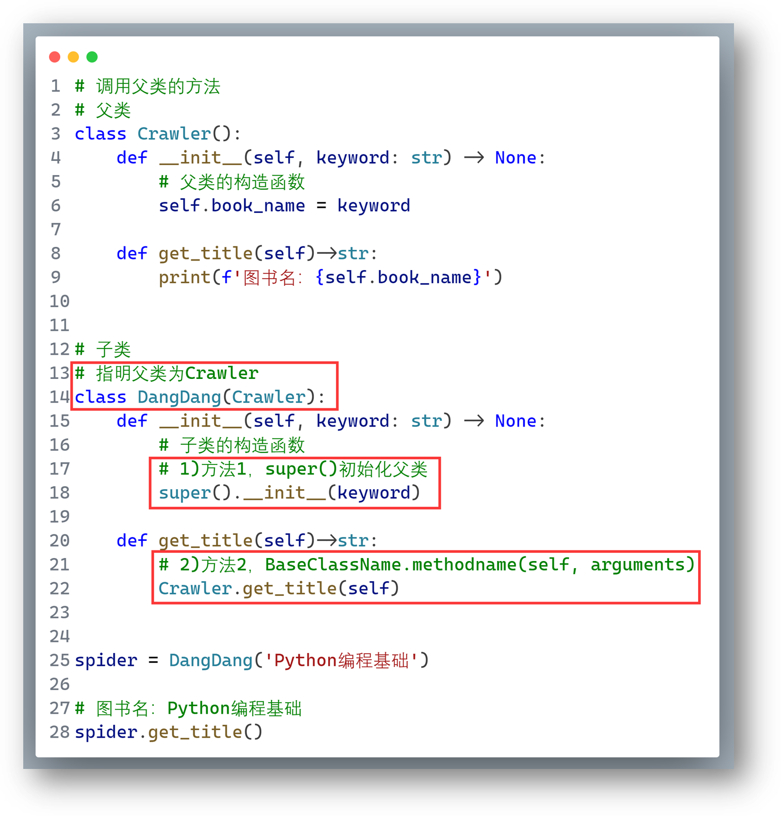 如果要在子类中直接引用父类的方法,可以使用super( )方法。我们来写一个简单的DangDang类,继承自Crawler类,只有构造函数。