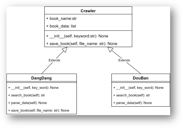 从上面的UML类图中可以看出,search_book( )方法和parse_data( )方法是两个子类新增的,在父类中没有,且两个子类中实现的功能也不一样,一个是针对当当网,另一个是针对豆瓣网。