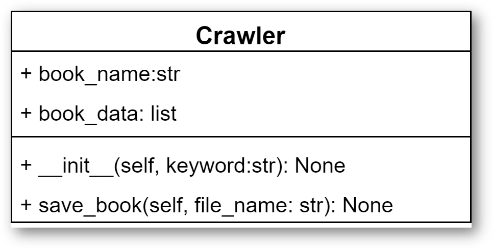 Crawler类包括了两个属性,一个是表示书籍名称的字符串book_name,另一个是存储书籍信息的列表book_data,此外,它还有一个构造函数,以及将图书数据写入文件的成员方法save_book( ),该方法需要一个字符串类型的形参file_name,表示要写入文件的路径与名称。