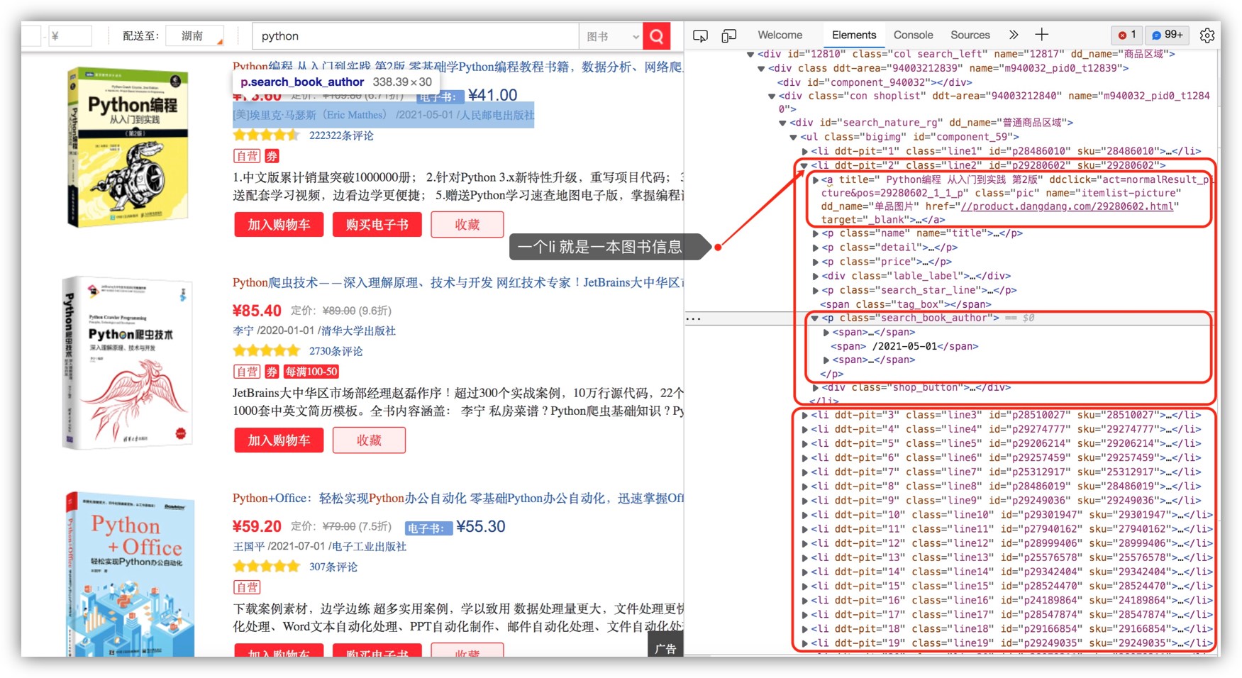要解析数据,先要分析HTML的DOM结构,我们可以直接使用浏览器在当当网上查询图书后,在页面任意位置右键鼠标,在快捷菜单中选择“检查(inspect)”,选择“元素(Elements)”选项卡就可以看到我们通过程序查询返回的HTML文件内容了。