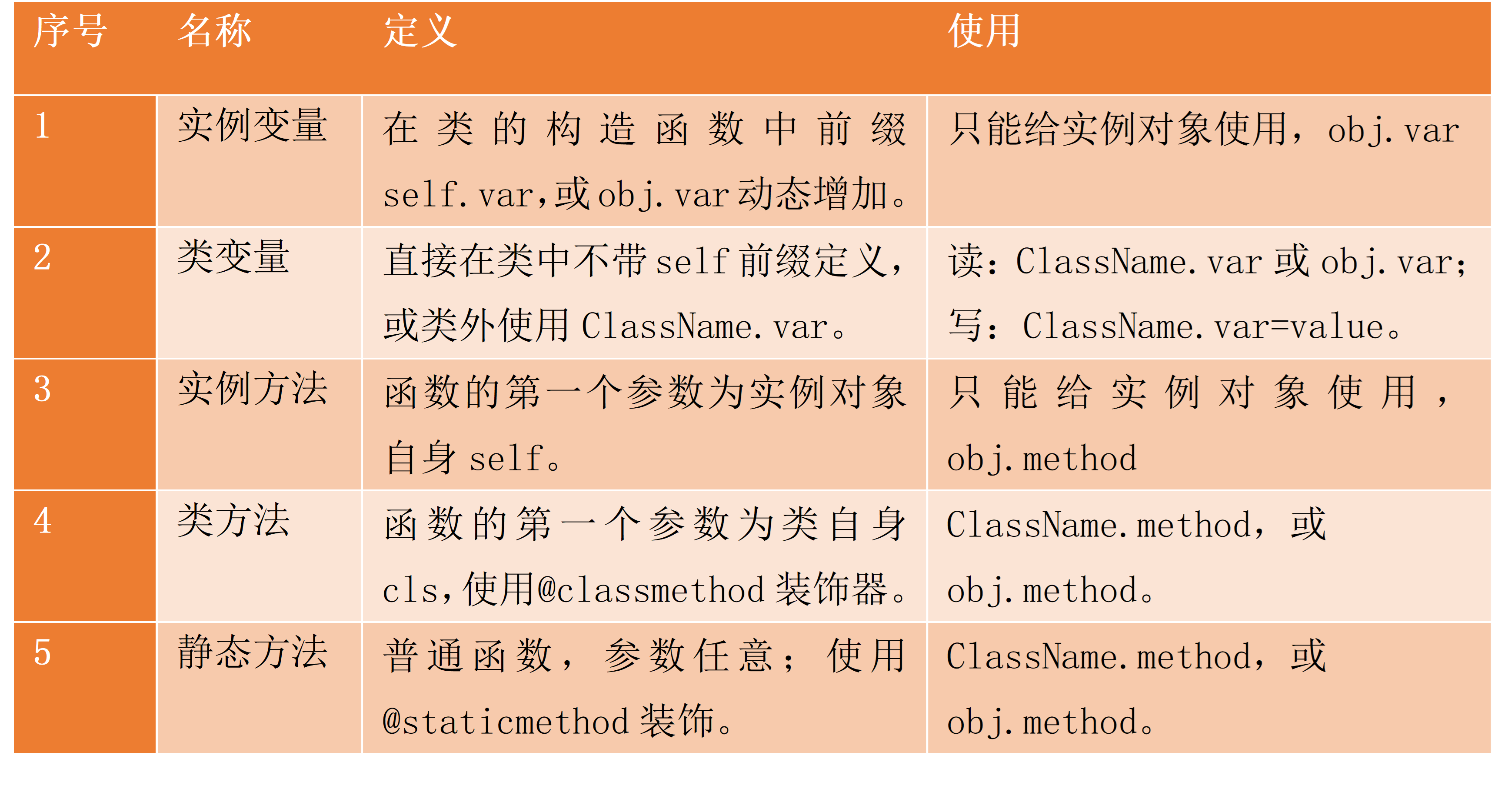 关于类和实例对象的属性和方法,我们归纳总结如下表所示: