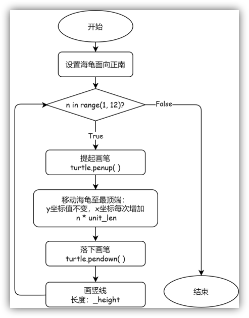 我们再用for-loop循环来为背景矩形画上辅助竖线。要分隔12等分,只需画11条线,意味著画线的过程要重复/循环11次,考虑到每次循环时起点位置的y坐标值没变化,但x坐标值从左侧起点位置(start_x)逐步向右边/原点移动、每次一个单元宽度(unit_len),生成的数字序列从1开始,到12结束/不包含12,而11条竖线就可以等分12份,range函数为:range(1, 12)。程序流程图见图3-7画竖辅助线流程图。