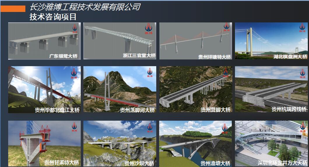 雅博公司自成立来,先后为贵州省杭瑞高速公路北盘江大桥(主跨720m斜拉桥,世界第一高桥)、正安县渔塘大桥(主跨200m拱桥)、毕节市落脚河大桥(主跨275m斜拉桥)、贵州峰林特大桥(主跨550m悬索桥)、开州湖特大桥(主跨1100m悬索桥)、长沙金桂路浏阳河大桥(矮塔斜拉桥)等特大型桥梁提供BIM技术服务,开发了多款基于BIM技术的项目信息化管理云平台,拥有软件著作权6项。