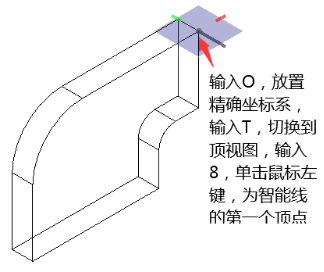 放置智能线>输入下一个顶点或重置以结束——设置顶点类型为圆角,半径为5,向下移动鼠标,捕捉长方体右后角点,单击鼠标左键。